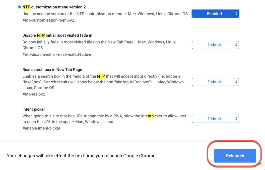 然後右下方就會出現 Relaunch,按下去瀏覽器就會重新開啟,上面的 Enabled 項目全部選完再按就好,不用選一個就重啟一次。