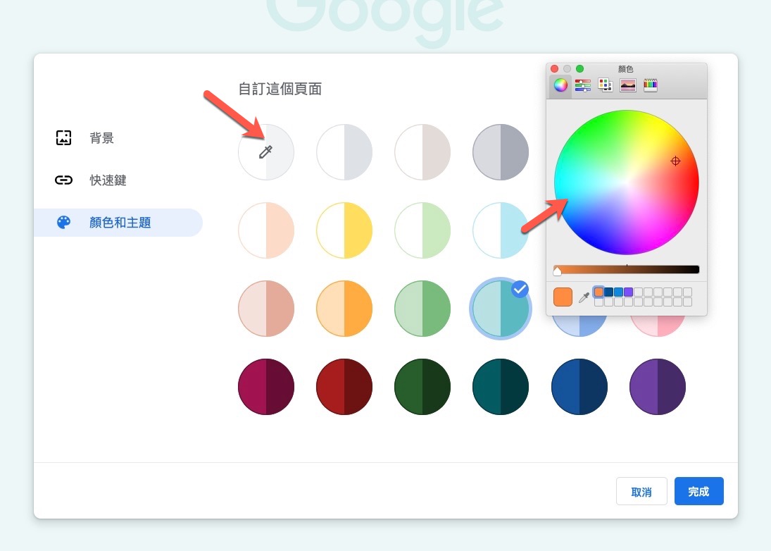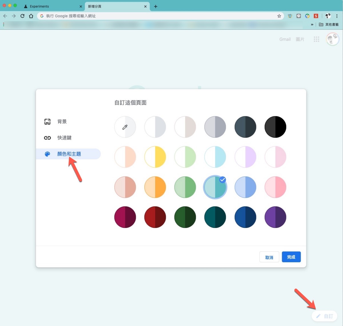 重啟完成後,開啟一個新的分頁,點擊右下角原本就有的「自訂」,你會發現比起原本的自訂功能多了一個「顏色與主題」,直接選擇右邊的顏色就能變換 Chrome 的外框色系了,很簡單吧。