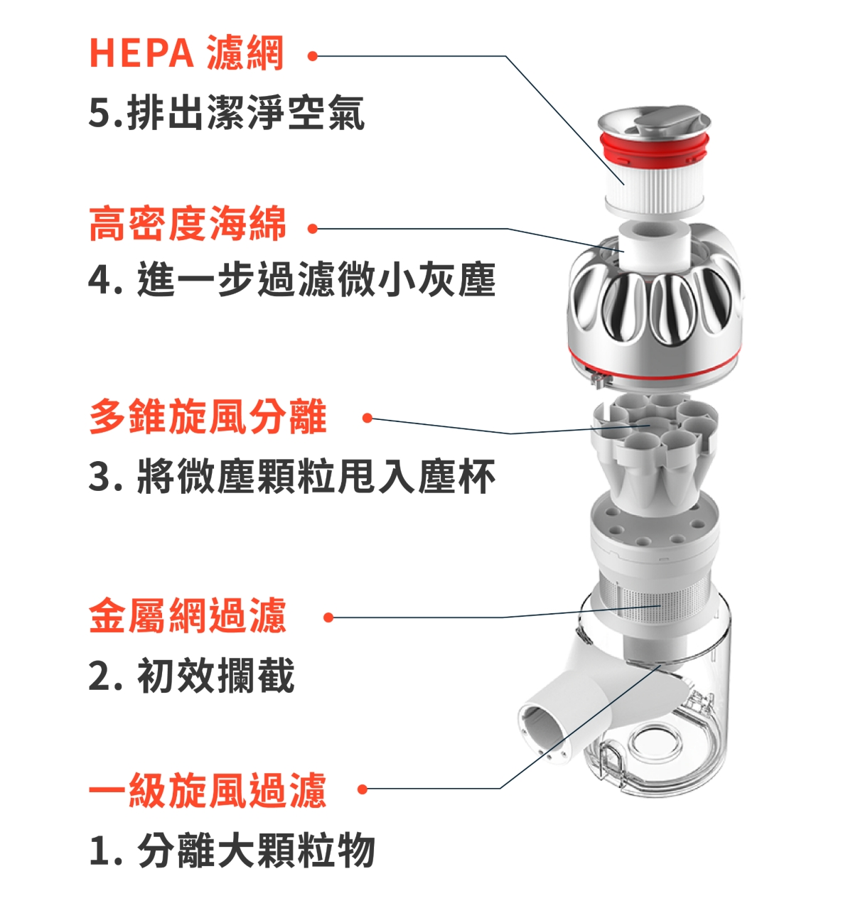 濾網一共有五層過濾系統,如圖所示。