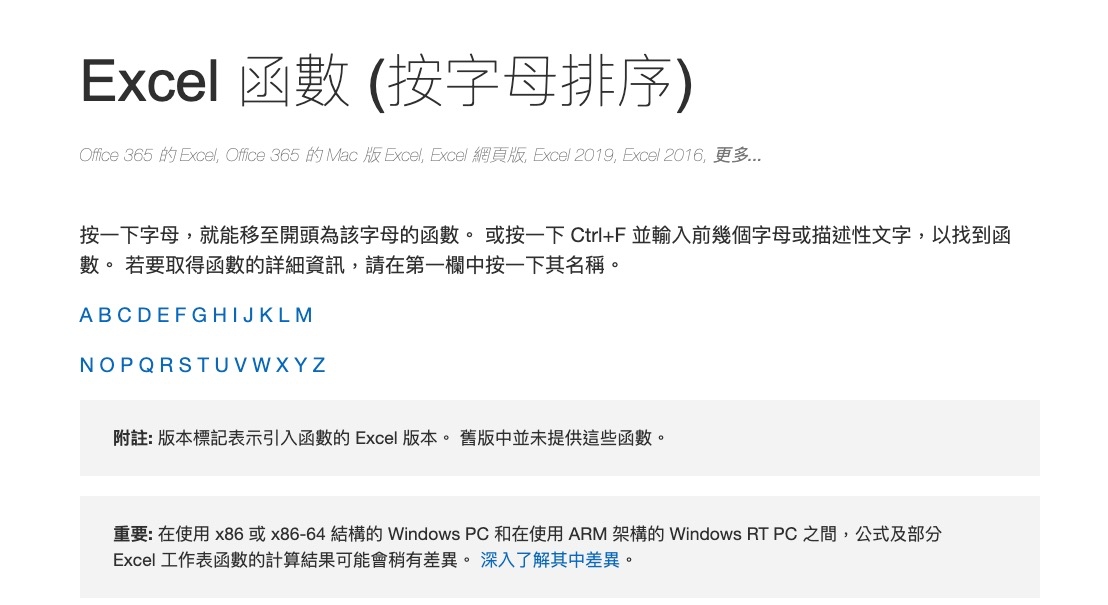 進入該頁面後,上方就會有 A~Z 可以直接點選,或者你直接 Ctrl+F 搜尋網頁也可以,這邊的函數是照字母排序,非常的便於搜尋。