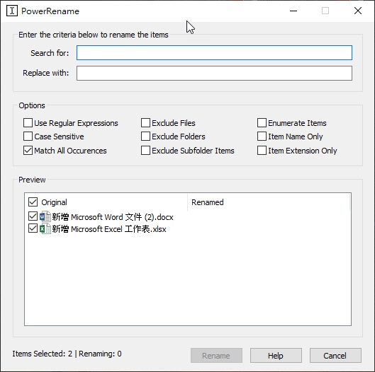 第二個功能是 PowerRename,這項功能啟用後就會在檔案右鍵選單裡看到,如果你一次要變更大量的檔案名稱,那可以直接全選檔案後右鍵進入 PowerRename。