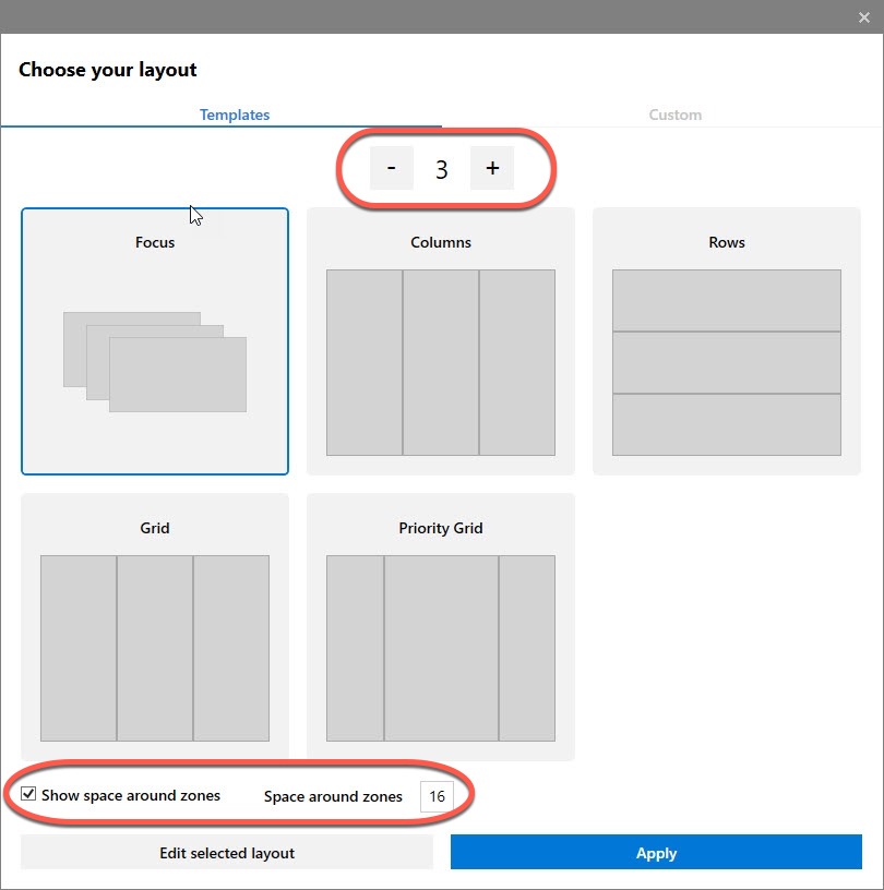 如果你隨時想要變更排列方式,可以按下快捷鍵 Win + ~,就可以呼叫這個畫面,然後選擇切分幾個視窗,也可以在 Custom 裡自訂排列方式,不一定要照預設的。