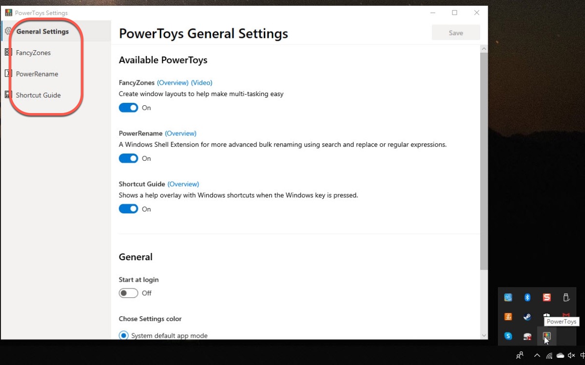 安裝完後就可以在系統列中看到 PowerToys 的圖示,建議可以按預設開啟開機啟動,因為這是平常就會用到的功能,在 General Settings 裡可以選擇開啟哪些功能,目前有三個可以選擇,往下來介紹。