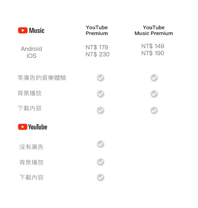 - YouTube Music Premium - Android $149 元 / 月、 iOS $190 元 / 月; 家庭方案 Android $229 元 / 月 ; iOS $290 元 / 月