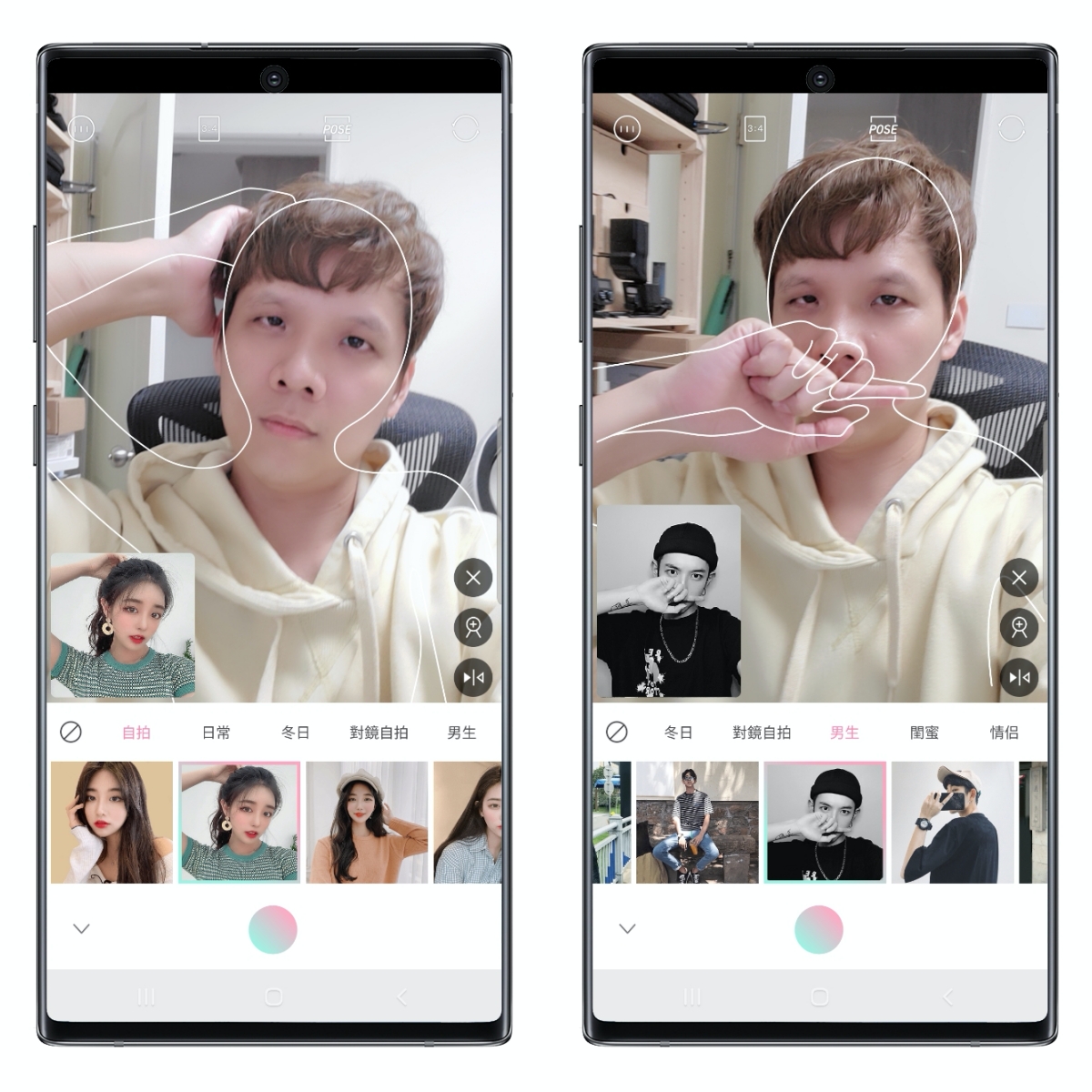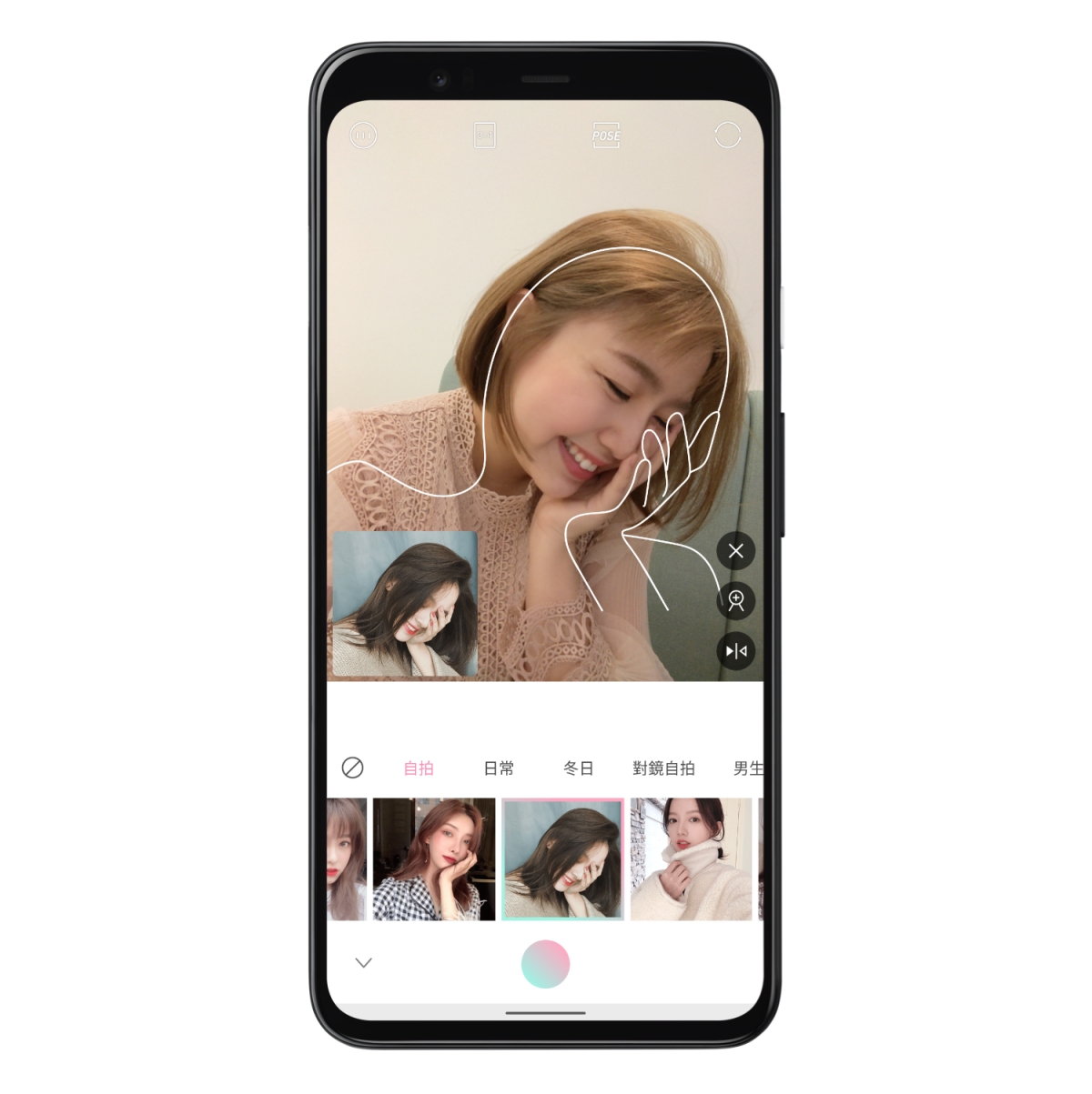 進入到 Ulike APP 後,一般正常使用就是像這樣,單純的美顏或濾鏡套用等,但如果想挑戰一下網美的姿勢,可以點擊上方的 POSE 功能,就會出現了。