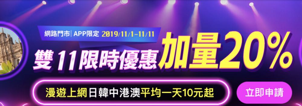 。日韓原號漫遊上網吃到飽,申辦 4 天以上享 2 日免費優惠,11 月 11 日至 11 月 14 日限時在台灣大官網領取,可使用至 2019 年底。