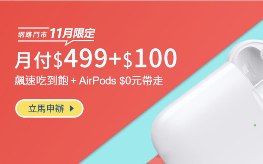 申辦遠傳 599 上網+網內雙飽,還贈送每月網外 30 分鐘,更可 0 元把市價 $5,290 的 AirPods 帶回家!
