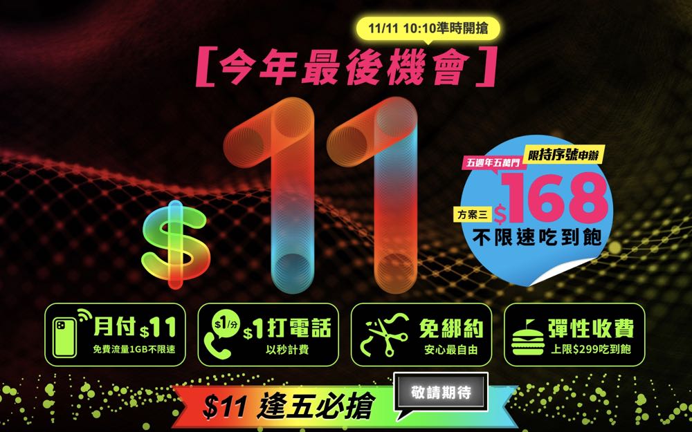 $11 - 不綁約、享 1GB 不限速上網,通話費率每分鐘 1 元,超過流量每 GB 30 元,月租費最高只收 299 元;