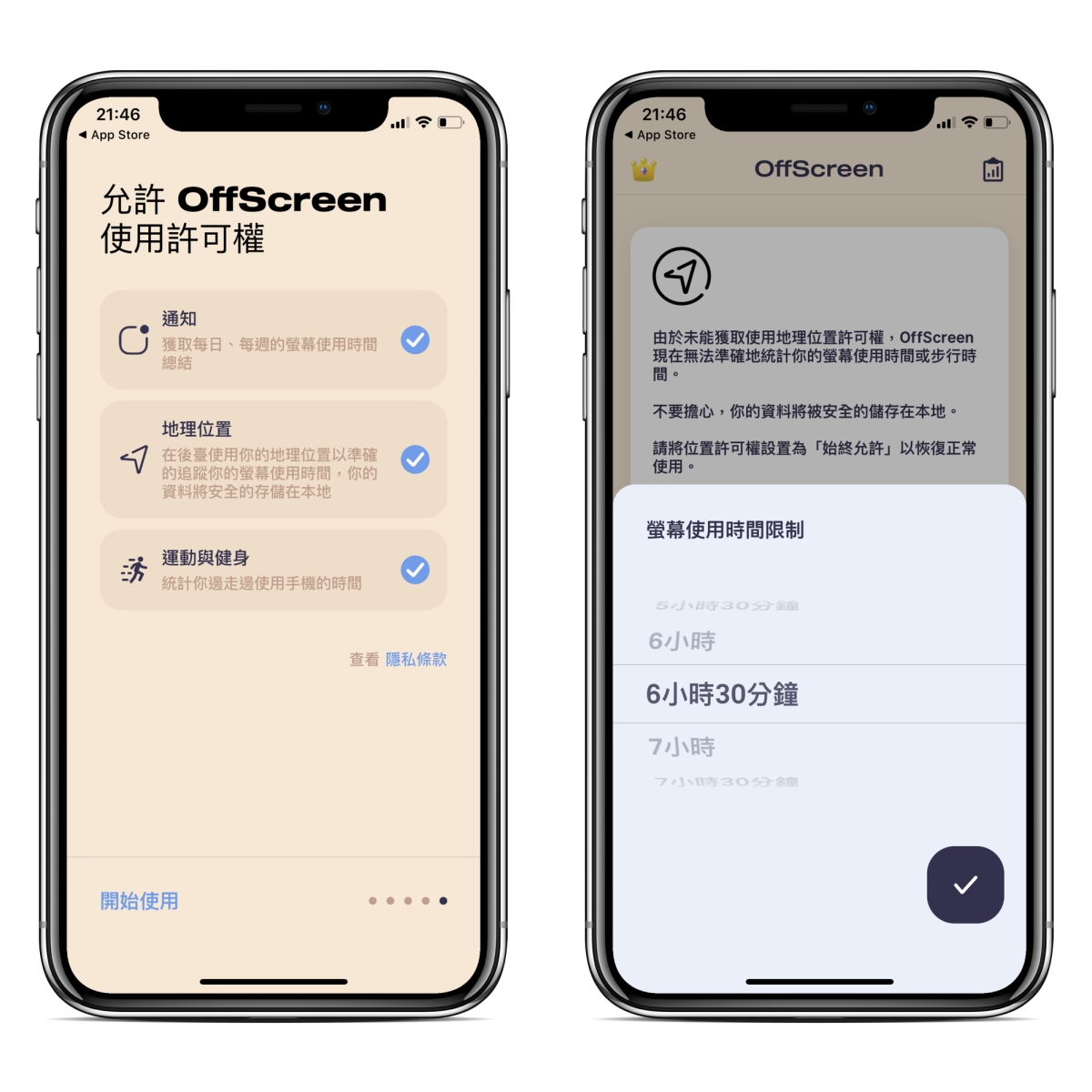 許要授權的包括通知、位置取得以及運動健身,最初會需要你設定螢幕使用時間限制,時間到了會提醒你,但不會強迫無法使用,不用擔心,只是讓你可以知道你已經看了很久的手機。