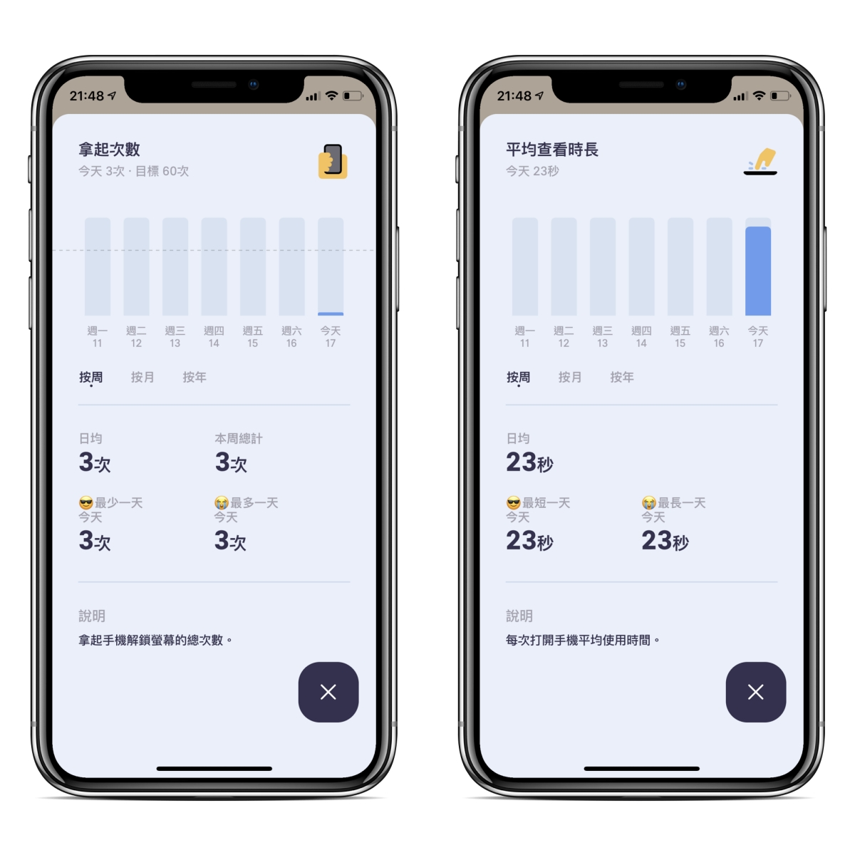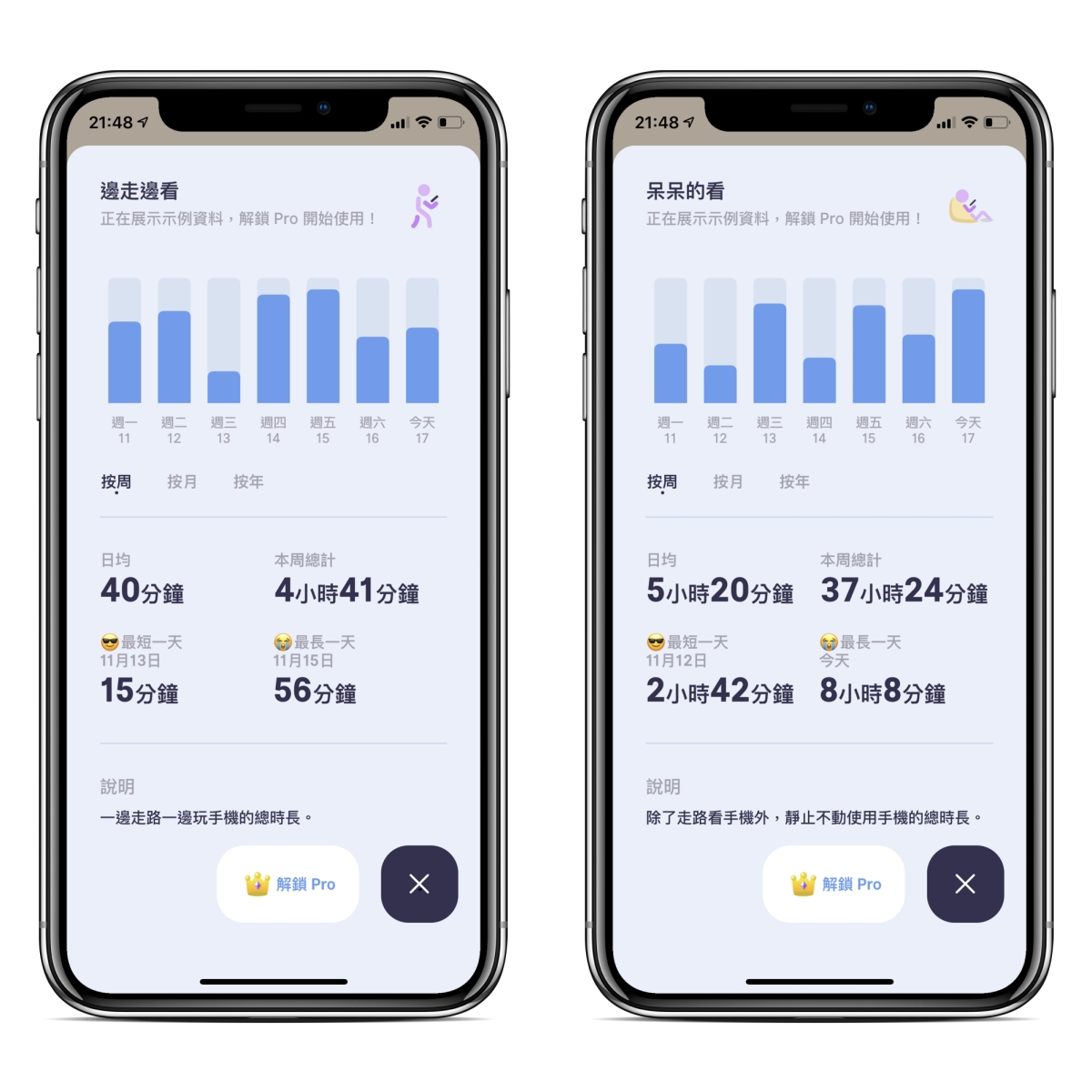 如果你想要統計的更加詳細,專業版還有統計邊走邊看、呆呆的看(也就是沒滑動)、最後放下及第一次拿起時間、最久沒看手機的時間以及睡眠時間,專業版並不貴,只要 70 元台幣就可以解鎖全功能,算是很便宜。