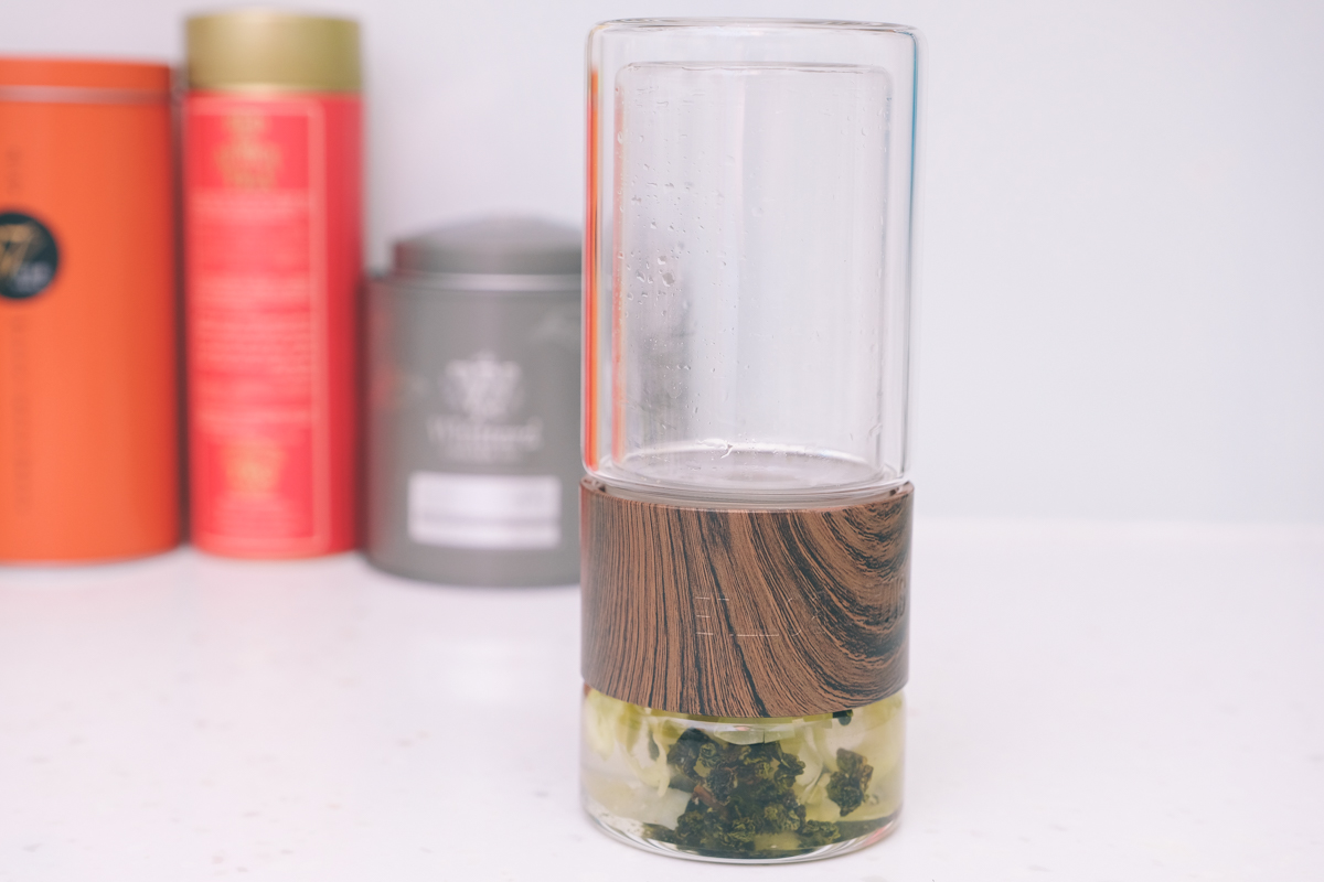 這一共可以拆成三個部份,左邊主要是用來裝熱水,俱有雙層玻璃設計,所以喝茶拿的時候也不會燙,中間是木環加橡膠加不銹鋼濾網,右邊是放置茶葉,但右邊這個小杯的不是雙層玻璃,所以在泡茶時要注意一下,別被燙到了。