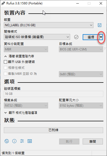 進入軟體後,請將要製作成安裝碟的 USB 隨身碟插到電腦上,然後在選擇的右邊會看到可以下拉。