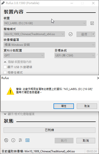 最後再跟你確認一次,你的 USB 隨身碟會被清除,確認沒有資料才使用這一個,按下確定後就會正式開始製作囉。
