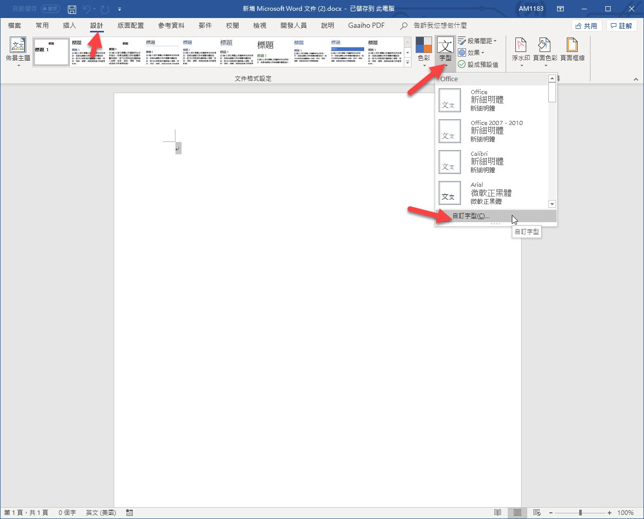 首先,切換到上方的「設計」頁籤,在字型下拉後,進入「自訂字型」。