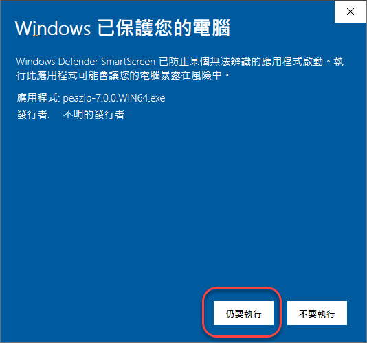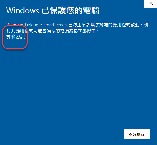 在安裝時,如果有啟用 Windows Defender 可能會出現這樣的畫面,這工具確定沒有什麼問題,可以點擊其他資訊來繼續。