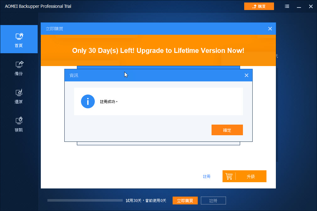 由於磁碟管理工具 AOMEI Partition Assistant Professional 之前阿湯就買過付費版本,所以這次就趁機買一下備份工具 AOMEI Backupper Professional 5.3 Edition(雖然我很想買套伺服器版本來用),不過還沒買過的人,大推薦可以先買套磁碟管理工具來用,如果送 Windows 10 的話,你也可以當做就是各花 300 元啊。