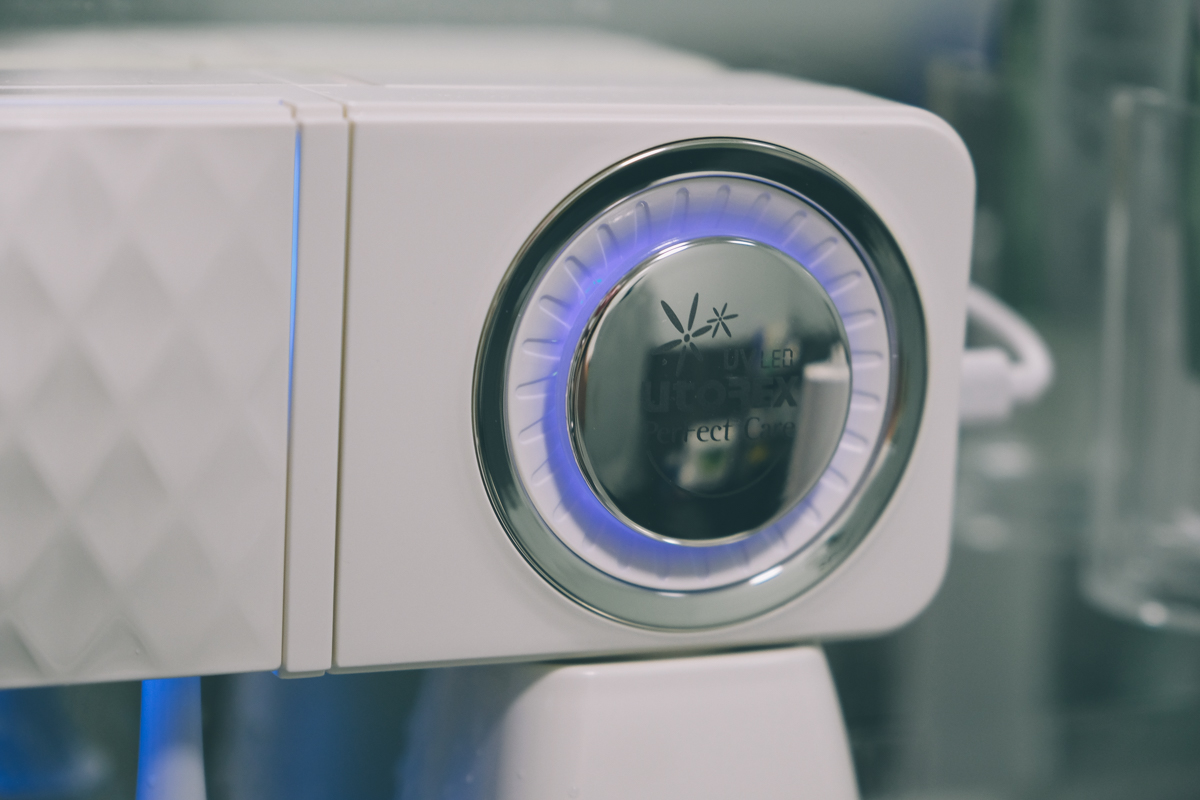 右邊這個我原本以為是會有抽風扇之類的功能,原來只是單純的指示燈顯示而已,紫燈是代表在殺菌中,其他像是充電是紅燈、滿電是黃燈。
