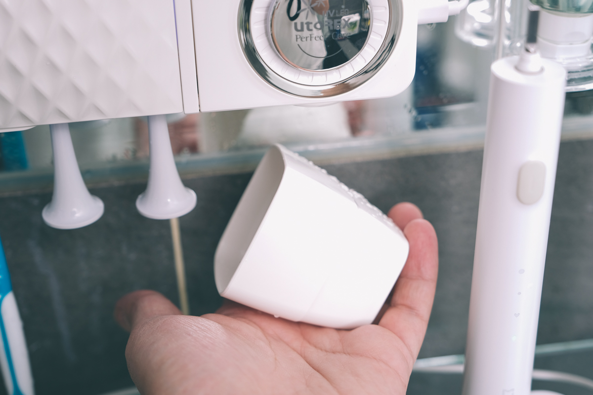 下方有一個倒過來的磁吸小杯子,可以用來嗽口使用,我覺得蠻方便的,但可惜只有一個。