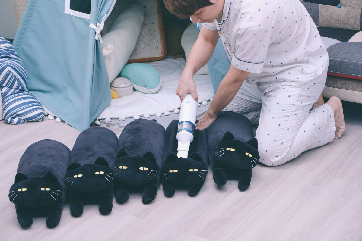 或是像這五隻排著隊等著被清潔的黑貓(家中玩偶也很適合用這來清潔)。