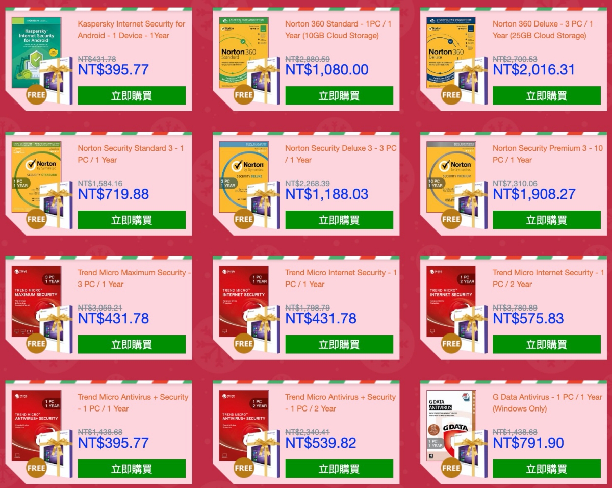 12 月最大的節日就是聖誕節,除了近期的雙 12 之外,聖誕節通常也會有各式各樣的優惠活動,特別是軟體不曉得為什麼在聖誕節特別會有優惠,而阿湯今天要分享的就是防毒軟體的優惠,全部的防毒軟體打八折之外,再送你 Windows 10,無疑就是超划算的一個方案,其中防毒軟體包括有各大廠像是卡巴斯基、諾頓、趨勢科技、McAfee、AVG 等,都是大家平常會安裝的防毒軟體,如果你電腦還沒有安裝防毒軟體,那就更要來一個了。