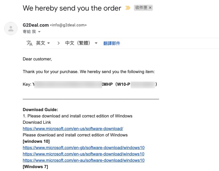 阿湯自己實測購買,會分別收到二封信,分別是防毒軟體的序號,以及 Windows 10 專業版的 OEM 序號,也會提供你軟體的下載連結,前往下載安裝並啟用就可以囉。