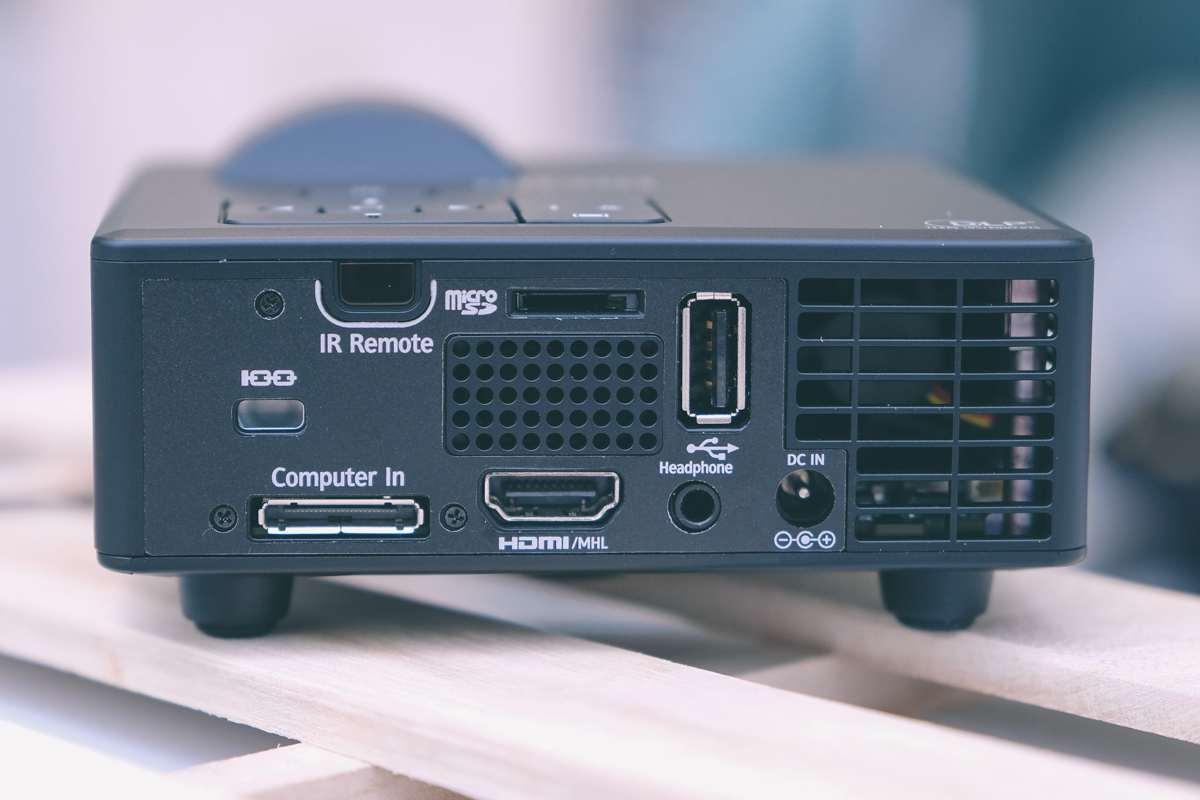 背面的 I/O,包括 USB -A,DC IN 電源孔、耳機孔、HDMI、microSD 以及 Computer In(VGA),預設是附 VGA 線材,如果有需要可以額外自行添購 HDMI 來使用,阿湯自己目前都是接手機來用,很方便。