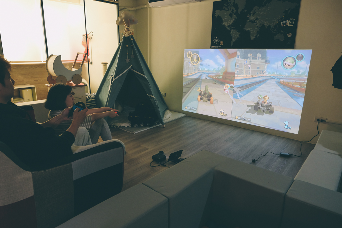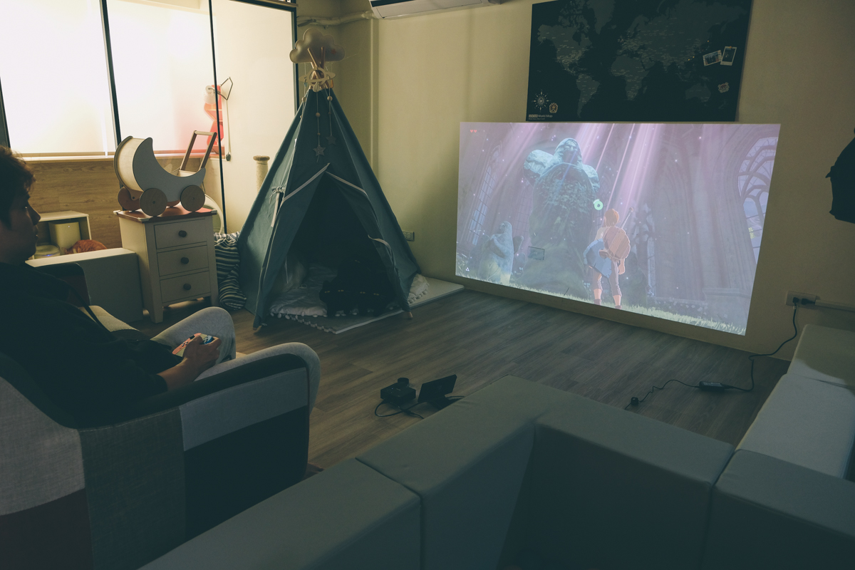 有時玩已經破關好幾次的薩爾達,我也是更喜歡用投影機一些,哦對了,我家因為沙發很輕,方便隨時移動,想要用到時就會利用沙發背後的白牆來投影,而且 RICOH 這台超短焦微投影機,只需要 172 公分就可以投到 100 吋了。
