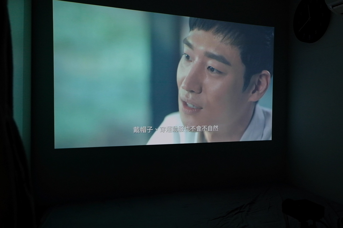實際來看一下畫質,這個是我投到大約快 100 吋的大小後的實際畫質,應該很有電影院的感覺吧。
