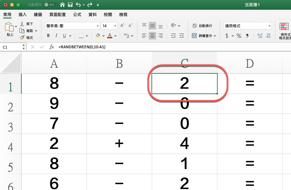 只要 A1 數字比 C1 大或等於就顯示減號,比 C1 小就顯示加號,為什麼要這樣呢?因為 A1 如果比 C1 小還有減號的話,那就會出現負數,對剛開始學加減法的小朋友來說,負數會是挺複雜的,所以我們只要加上 IF,就可以自動的加上對應的符號來計算了。