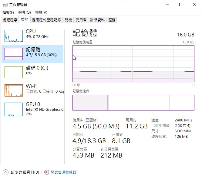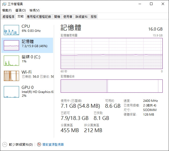 給大家看一下,我只是開了 20 頁我自己部落格的頁面,就用掉了 7.1GB 左右,我總記憶體的一半了,16GB 算是很多人電腦的量,大概都是這樣甚至更低。