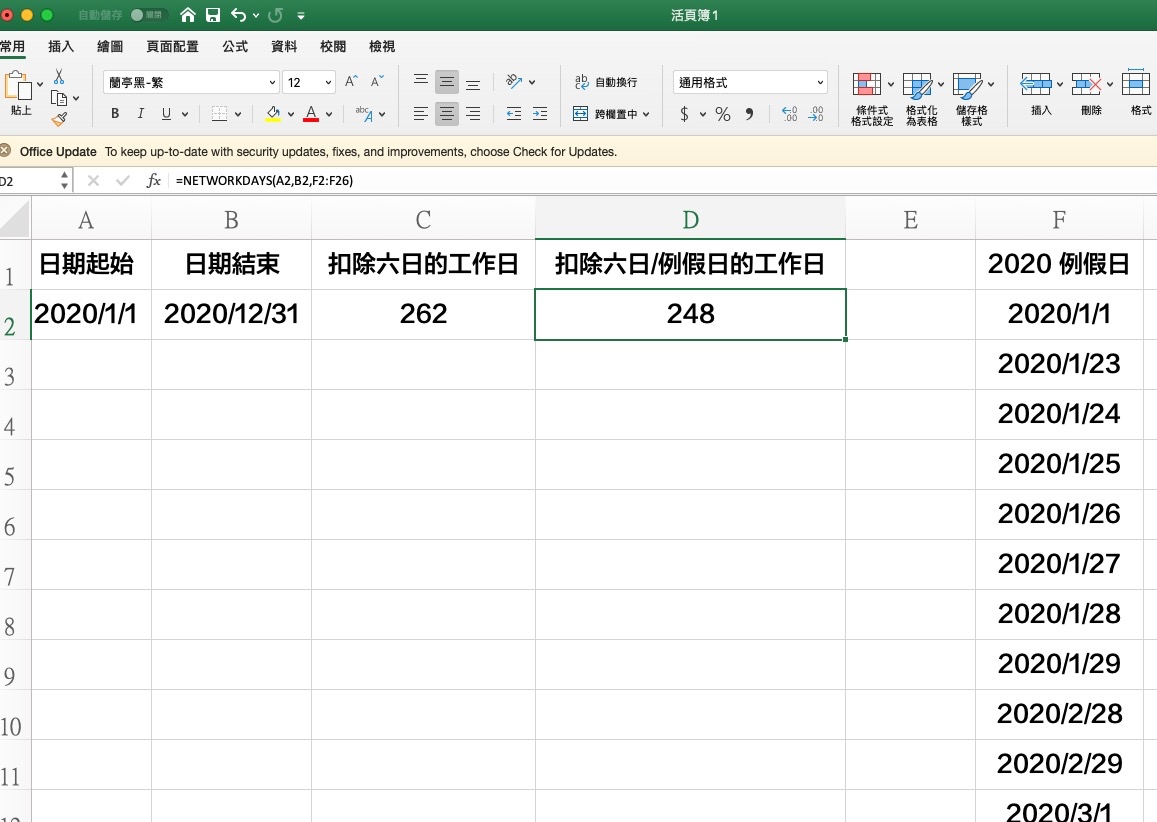 這個問題是在社團裡有鄉親們問到的,單純的就是想要計算某日期區間的工作日有幾天,而且要扣除全部六日及例假日,當然也要算上補班的部份,如果單純只是要計算非六日的日期很簡單,只要用 NETWORKDAYS 就可以了,這就是用來計算工作日用的,但如果要加上假日的計算要怎麼做呢?其實就是要自己建一下資料了,往下我們就來看看要怎麼做,順便來算算 2020 年要上幾天班吧。