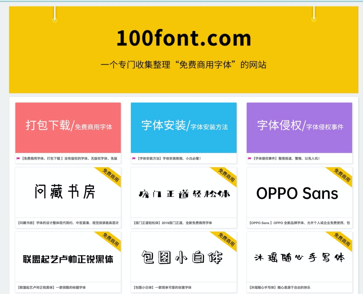 由於商用字體侵權問題屢見不鮮,所以如果你真的不想付費使用這些字體,不妨就找找可以商用的免費字型,其實這類字型並不在少數,阿湯先前也分享過不少,但如果你想要有設計一點的字型,還是去付費購買吧,今天來分享一個專門收集「免費商用字體」的網站叫做 100font,裡面包括了很多阿湯曾介紹過的字型,像是台北黑體、清松手寫體、阿里巴巴普惠體等,其實都是相當不錯的字型,還可以一次打包將全部字體通通下載。