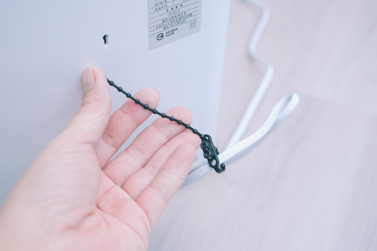 電線的部份還附有一個束線帶,可以直接掛在除濕機後方,不會讓線材因為拖地而被輪子勾到。