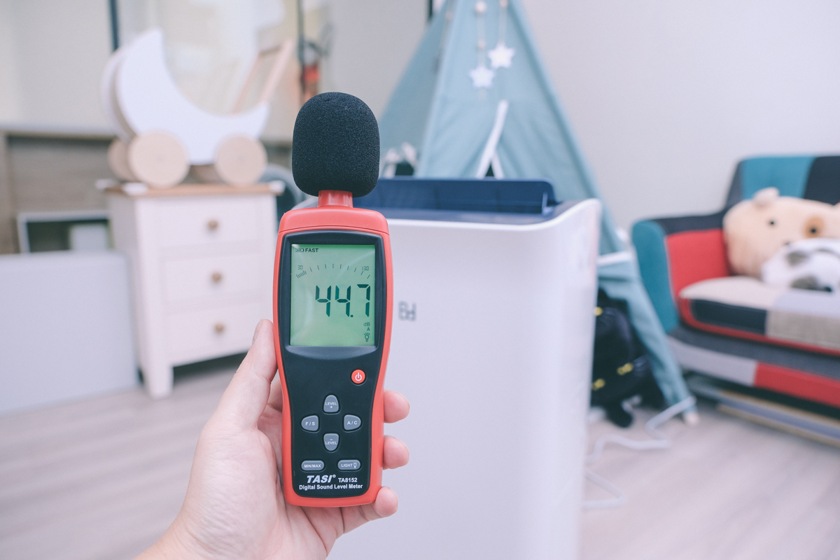 首先我們來看一下還沒有開啟除濕機前的噪音值,阿湯用分貝機測到的數值為 44.7dB,這是在家中只有空淨機的音量狀況。