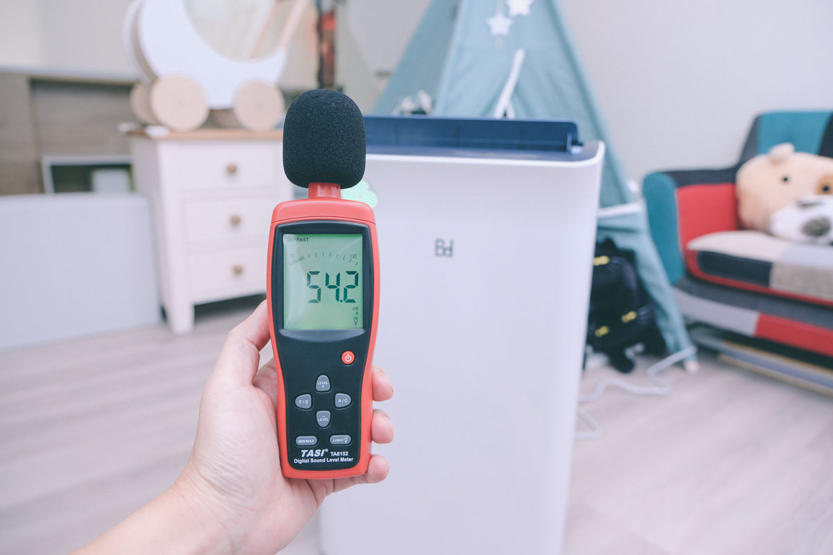 接下來我們直接開最強的風速進行測試,測得 54.2dB,這個音量比起你家裡的掃地機器人開最靜音還要小聲其實。