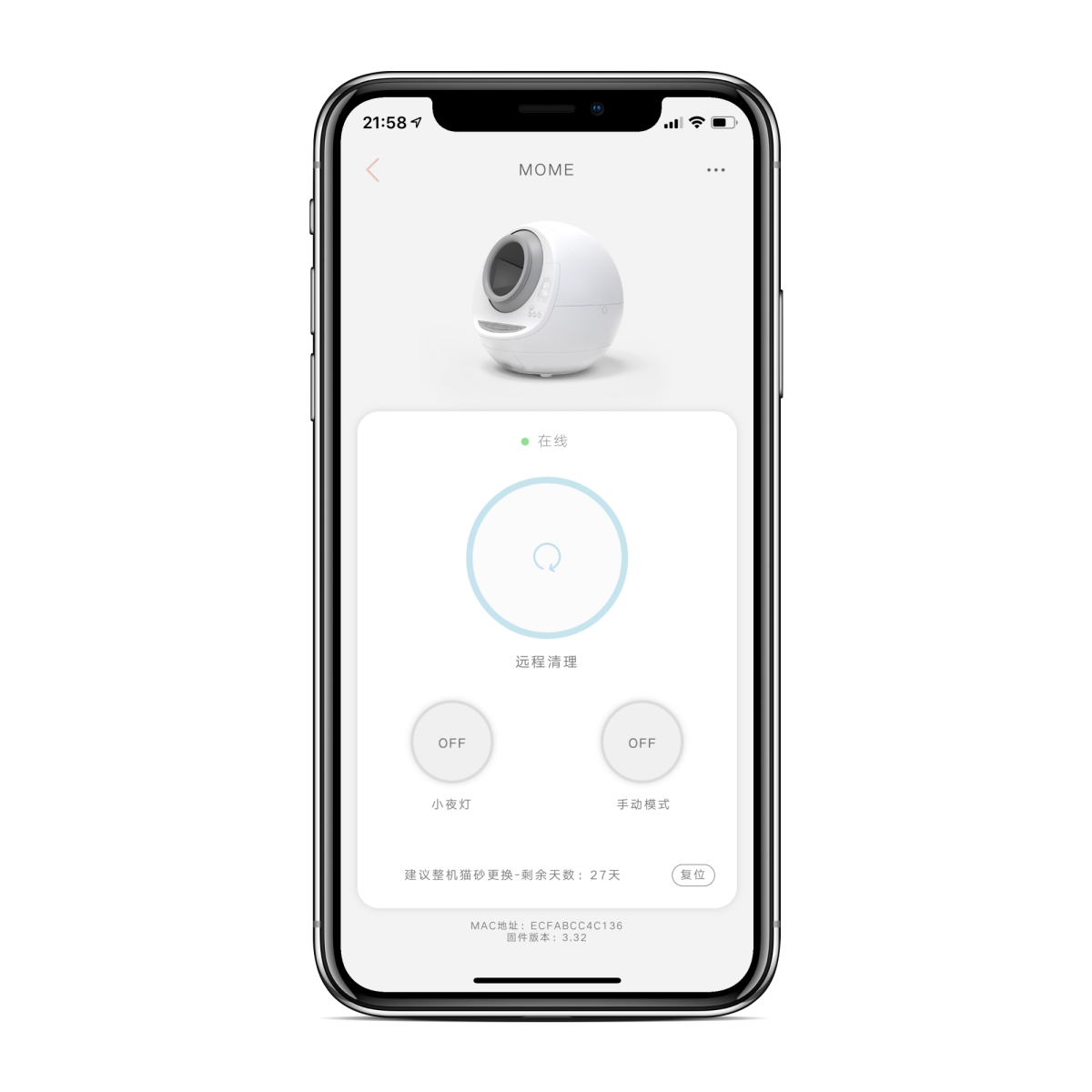 遠端操作的部份主要就是運轉、開啟小夜燈,跟切換模式,另外還有一個「復位功能」,點擊後可以將貓砂往反方向運轉,然後清掉所有球體裡的貓砂,如果你覺得砂變臭的話就可以這樣清出換一批,或者要洗球體前也可以這樣清空內部的貓砂,很方便。