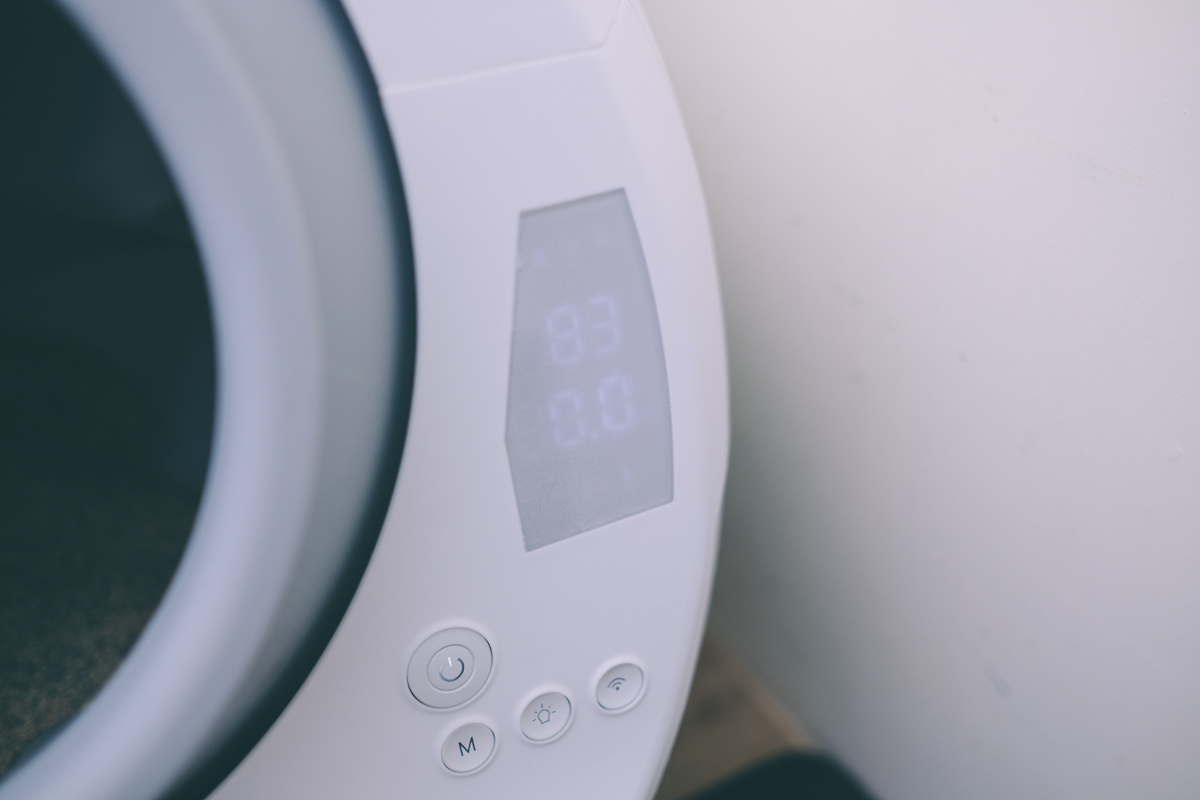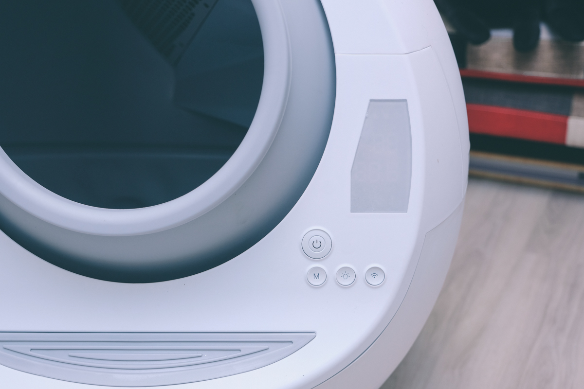我買的這台是 APP 版本,最大差別就是從 APP 可以收到通知及遠端操作運轉,其實也可以不用買 APP 版本,機器上的右邊是顯示螢幕以及操作鍵,M 按鍵可以切換自動或手動模式,自動模式下只要貓上完廁所後過一下就會自動運轉,手動就是等你自己按,中間的燈泡鍵是可以開啟底座夜燈,Wi-Fi 鍵就是設定 APP 連線使用的,平常電源鍵可以按一下啟動運轉。