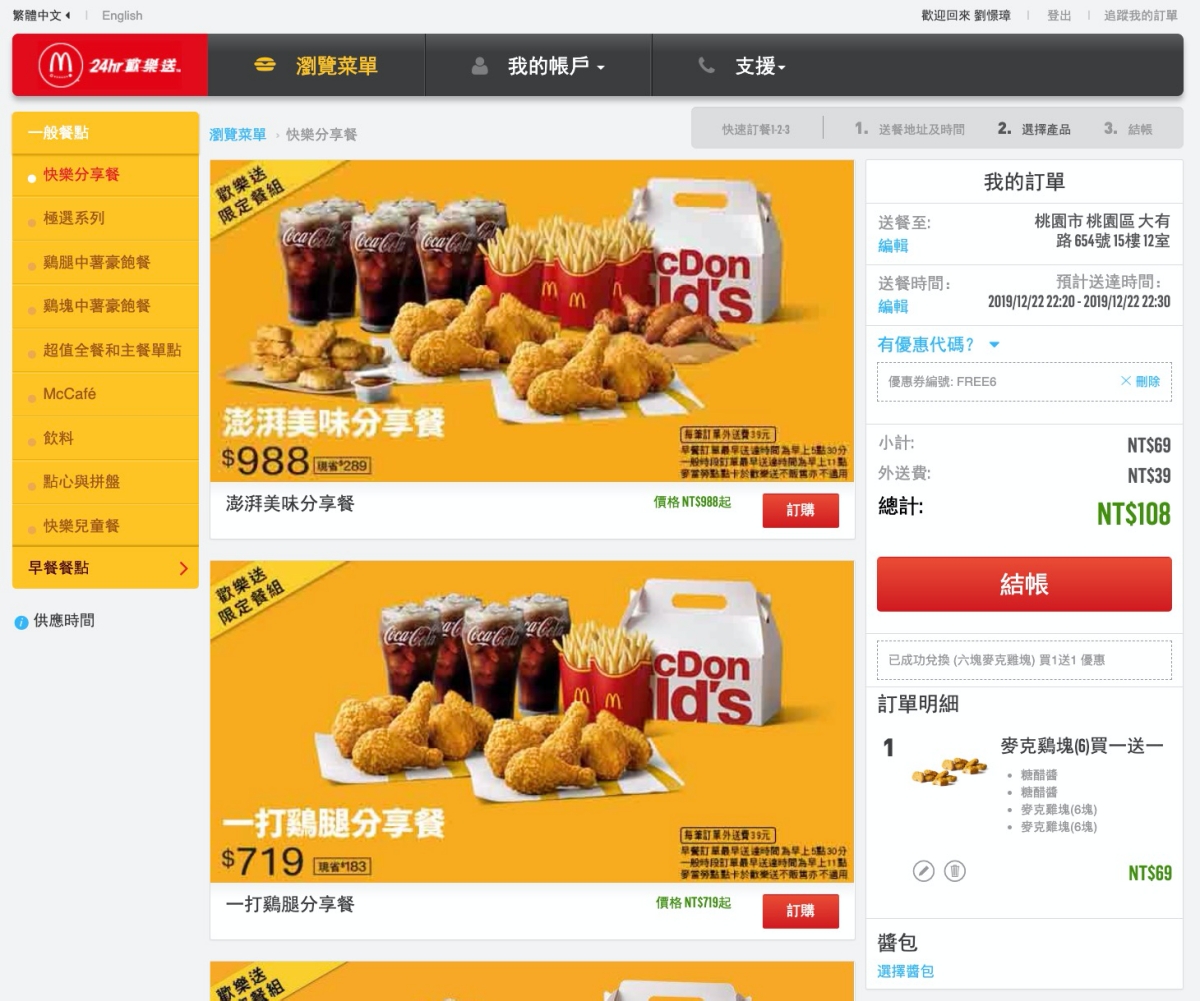 然後就會看到訂單出現買一送一了,但因為還有外送費 39 元,所以可以多點其他東西比較划算,大家一起吃起來!只到 12/30,最近有要叫麥當勞外送可以輸入一下優惠代碼。