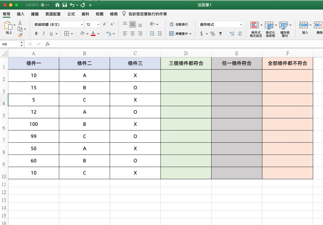 首先給大家看個簡單的範例,假設今天我們有三個條件需要去比對,可能會有的情況是,三個條件都符合、任一條件符合或是全部條件都不符合,當然還會有更多狀況,我們只是先用最簡單的範例,那麼依照下表這樣子的內容,你有想到怎麼做嗎?