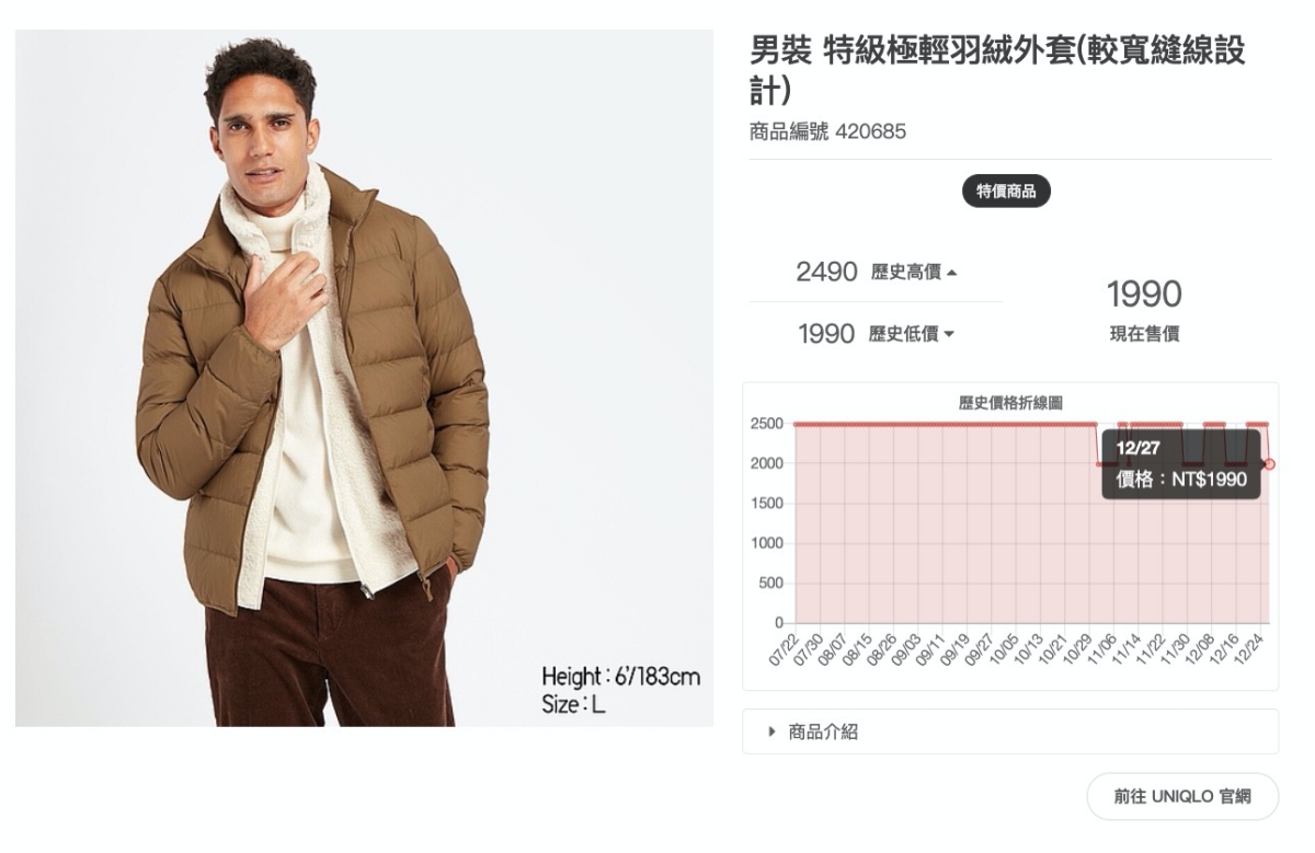 馬上就可以看到歷史價格的變化,還有最高跟最低價,就可以知道這件衣服是不是平價很常特價,通常有多少折扣等,不過 UNIQLO 只要有特價基本上都是維持先前的特價,也不會在特價前隨便先拉抬價格,所以基本上真的有特價的時候,大部份都會是最低價。