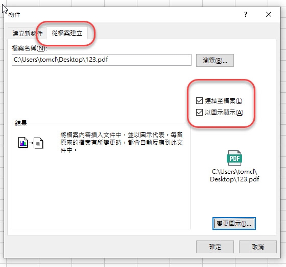 選擇「從檔案建立」,選好 PDF 檔案後,這邊有二個選項,以圖示顯示可以選一下,這樣就會以圖示顯示,另外「連結至檔案」這個選項常讓很多人誤會,我們先勾起來往下來說明差別。
