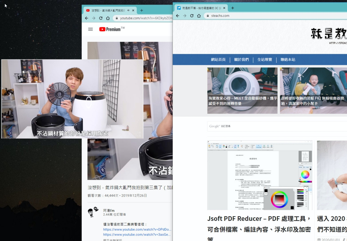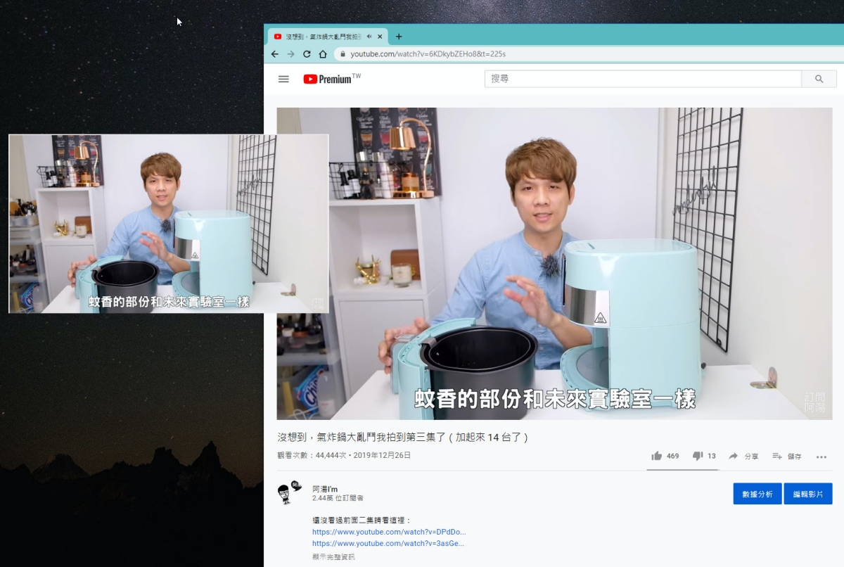影片就會像這樣截取出來變成一個獨立小視窗,你可以移動到任何一角,這個獨立視窗會是自動在最上層,不會被其他頁面蓋掉。