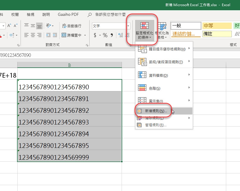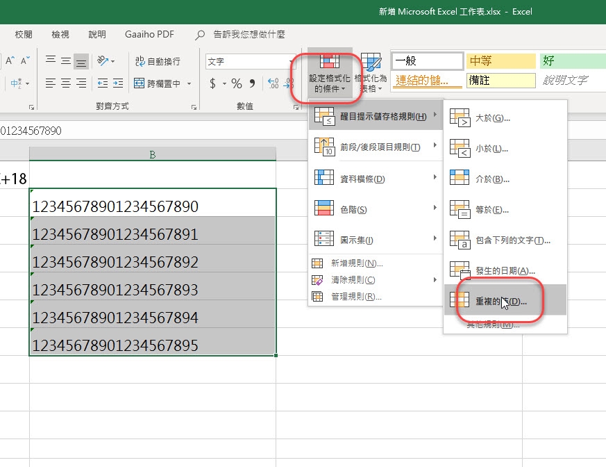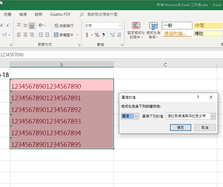 阿湯隨意打了六個數字串,前 15 位數都相同,最後一位數我有修改不同,但我們用設定格式化條件來篩選重複的值。
