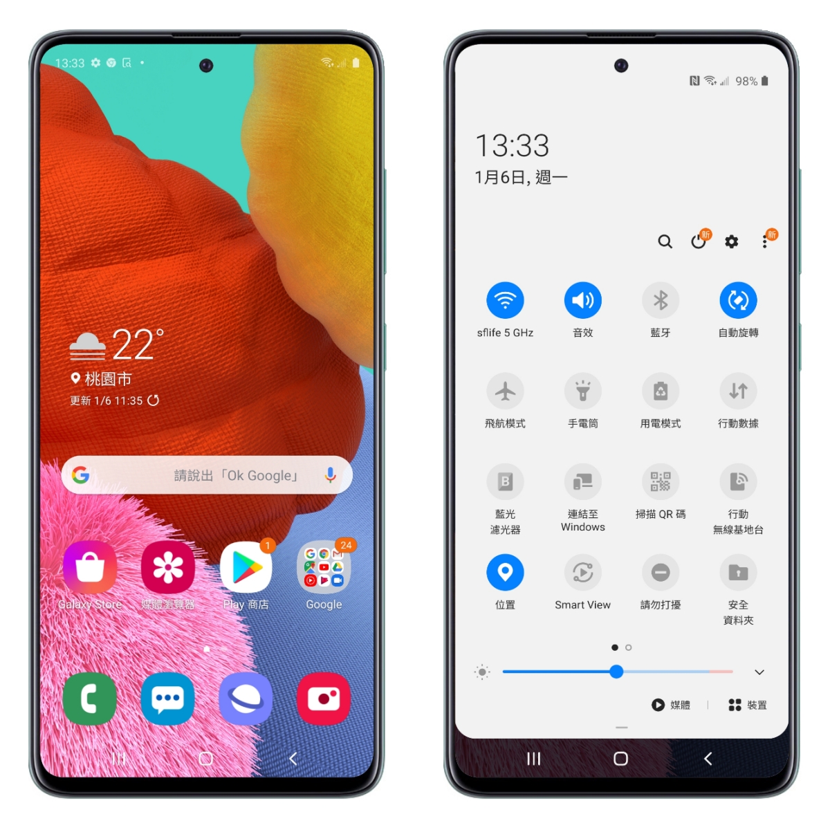 系統搭載的是最新的 Android 10 作業系統,而且支援 NFC 可以使用 Samsung Pay,其實 Galaxy A51 除了無線充電外,其他該有全都有了,硬體規格及功能都相當的完善。