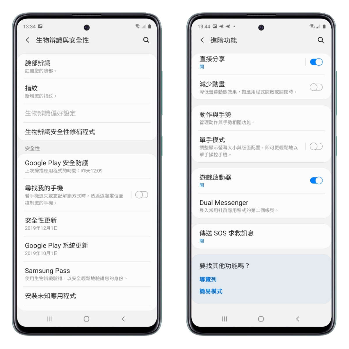 安全性的部份,支援臉部辨識及螢幕下指紋辨識,進階功能中同樣保留了可以雙開社群帳號的 Dual Messenger 的功能。