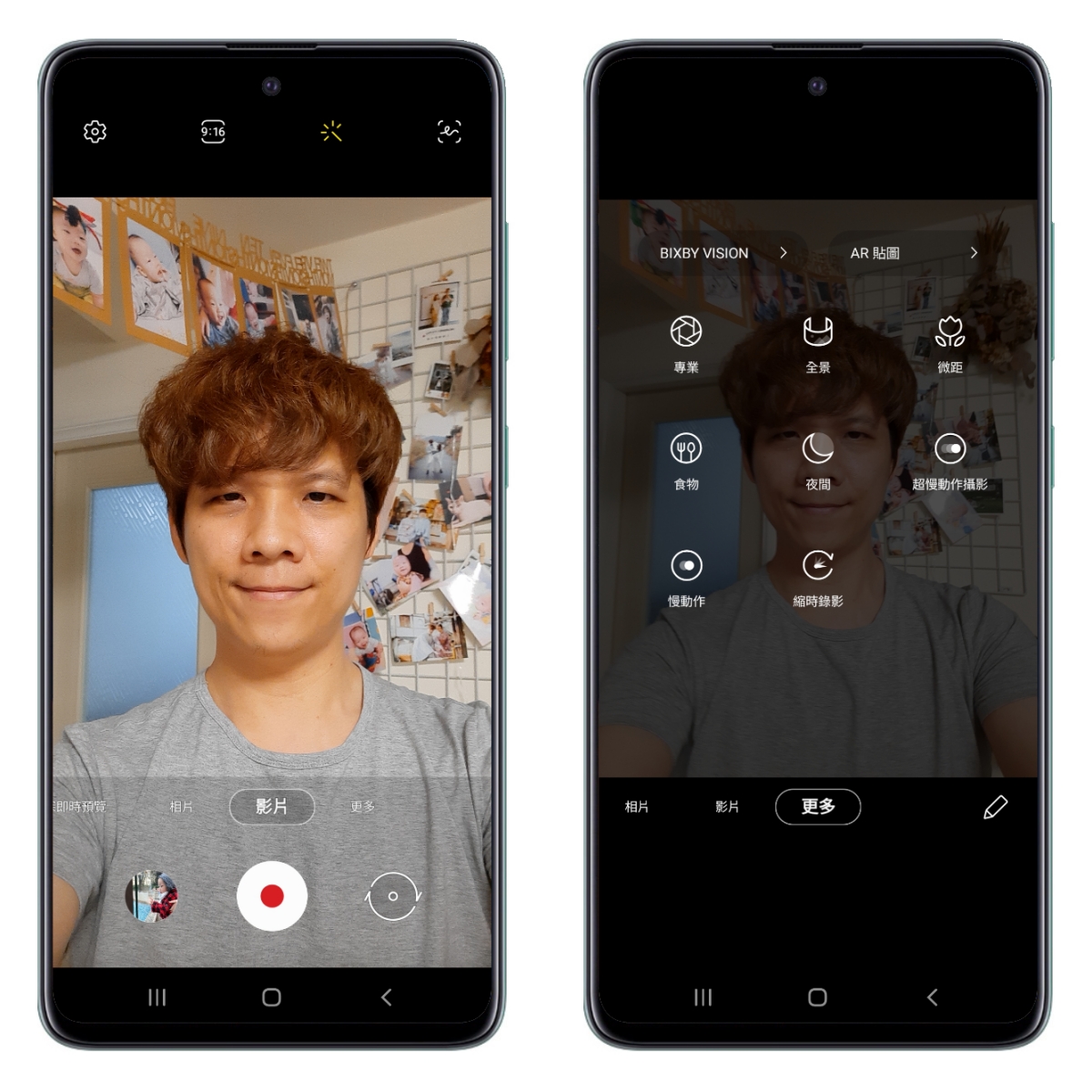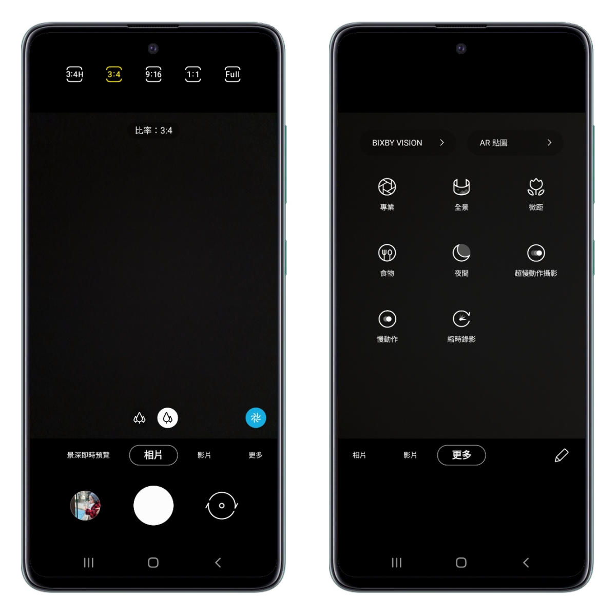 預設拍照的比例一共有五種可以選擇,另外拍攝模式除了第一畫面看到的自動模式、景深即時預覽模式、影片外,在更多功能裡還包括有專業、全景、微距、食物、夜間、超慢動作攝影、慢動作及縮時攝影。當然也支援了 Bixby 的智慧辨物功能及有趣的 AR 貼圖。