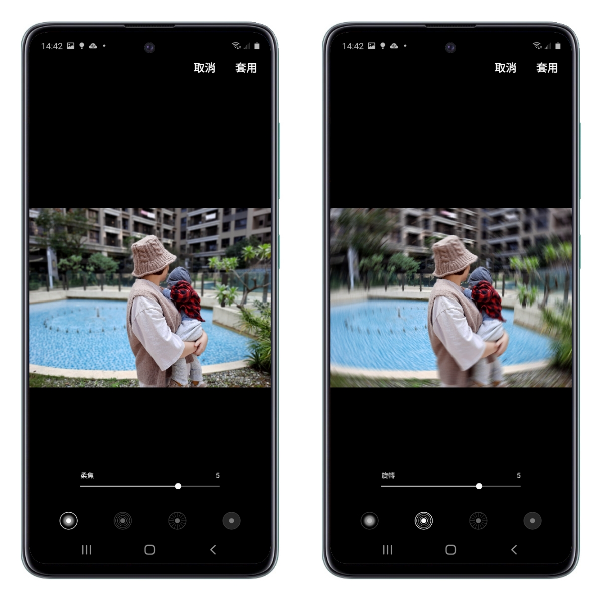 在 Galaxy A51 上的景深即時預覽模式下,在拍攝時只能選擇背景景深的等級,預設會是以柔焦的方式呈現,但其實我們拍攝完後,可以自行再選擇背景的景深模式,包括有柔焦、旋轉、縮放及抽色四種,透過不同的景深模式讓照片有著不同的呈現感受。