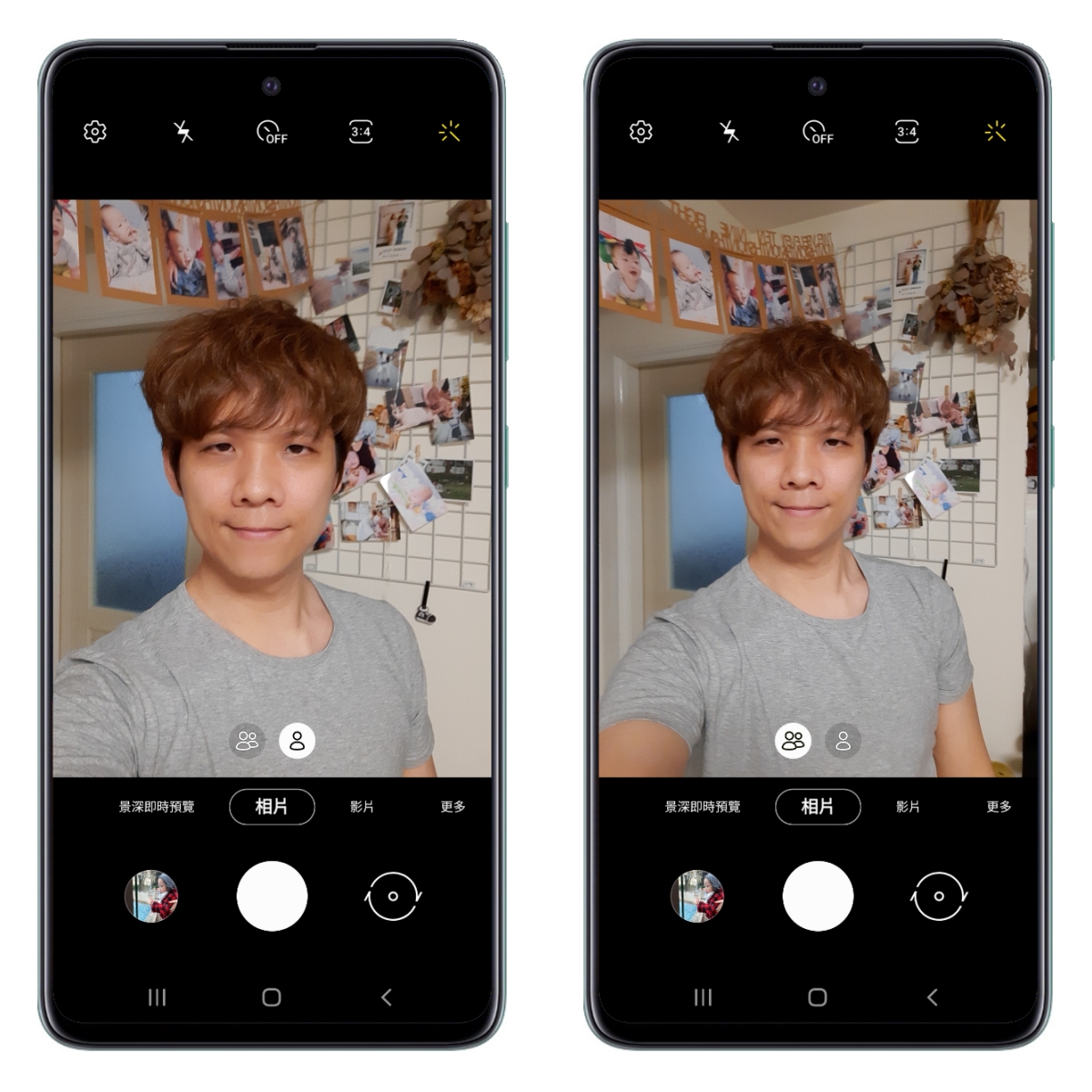 前鏡頭的拍攝支援廣角多人自拍,一鍵就可以切換自拍的廣角模式,這是阿湯一隻手伸直的長度所截下的畫面,原本大約適合二個人自拍剛剛好,開啟廣角後大畫面至少可以容納三個人左右。