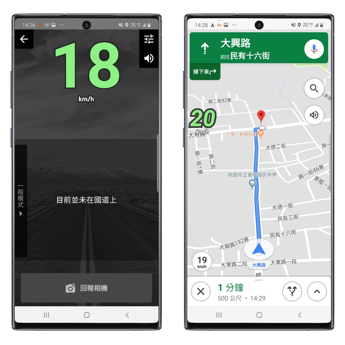 一般模式如下圖左,就是顯示目前速度,如果有在國道上行駛的話,下方還會顯示將會經過的閘道口以及預估時間,算是把傳統導航的資訊分離出來了。