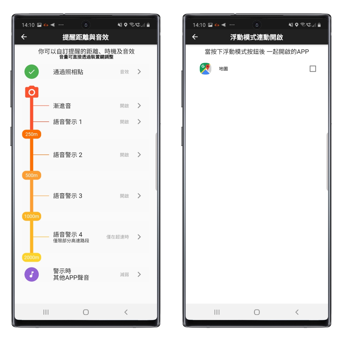 特別是這二個功能,提醒距離跟音效這個項目裡,你可以自己選擇離多遠的時候開始提醒你,有些測速 APP 都到剩幾百公尺才提醒,每次提醒距離有點不一定,但這個 APP 裡就可以自己選擇,我覺得非常的好。